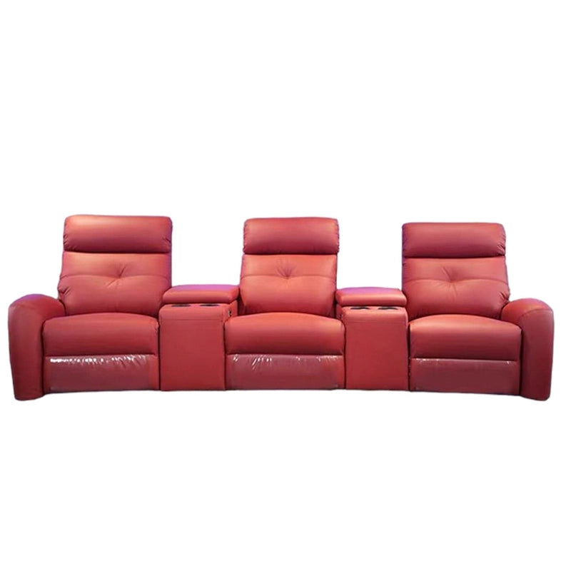 Red leather home cinema seating with home theater chairs and theater sofa seating, curved layout LED-lit armrests with flip-up storage in home theater recliner sofa and home entertainment couch