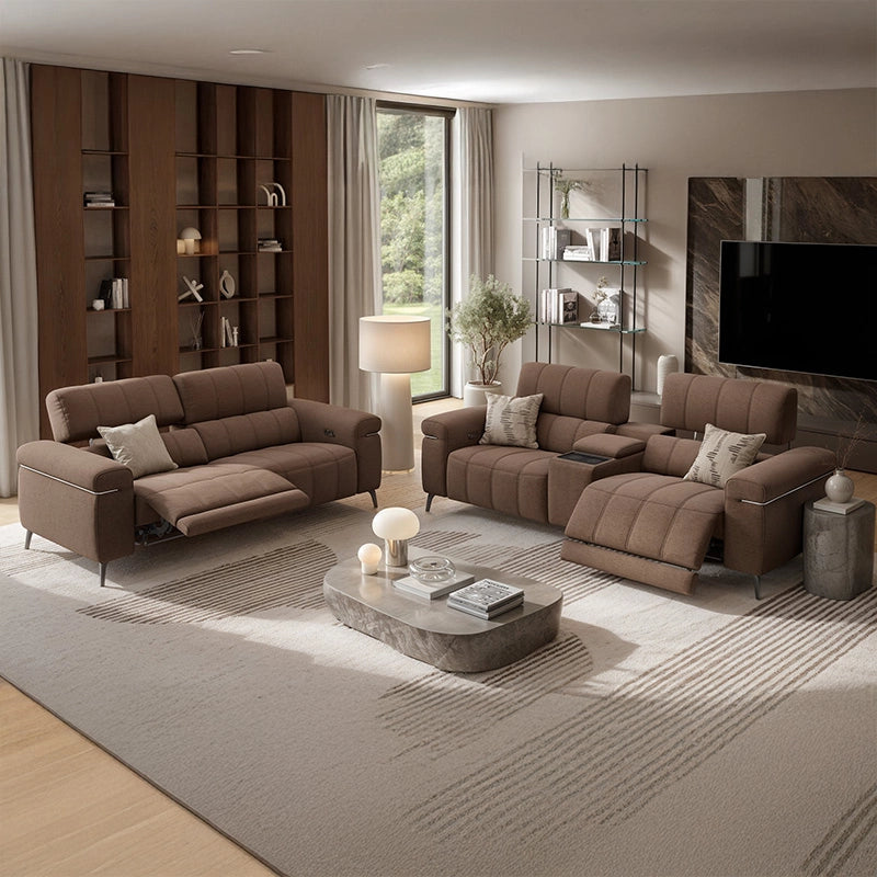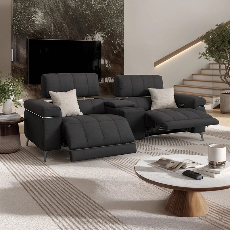 3-seater recliner sofa with cup holders, home theater chairs, theater recliner, grey Nova fabric Center console with cup holders and USB port, reclining movie seat, theater sofa seating, wine red tone Side view of plush padded arms, home entertainment couch, home theater sofa, earthy brown fabric Recliner with footrest extended, home theater recliner, home cinema recliner sofa, charcoal black tone Horizontal channel stitch closeup, home cinema recliner sofa, home cinema chairs, modern fabric finish