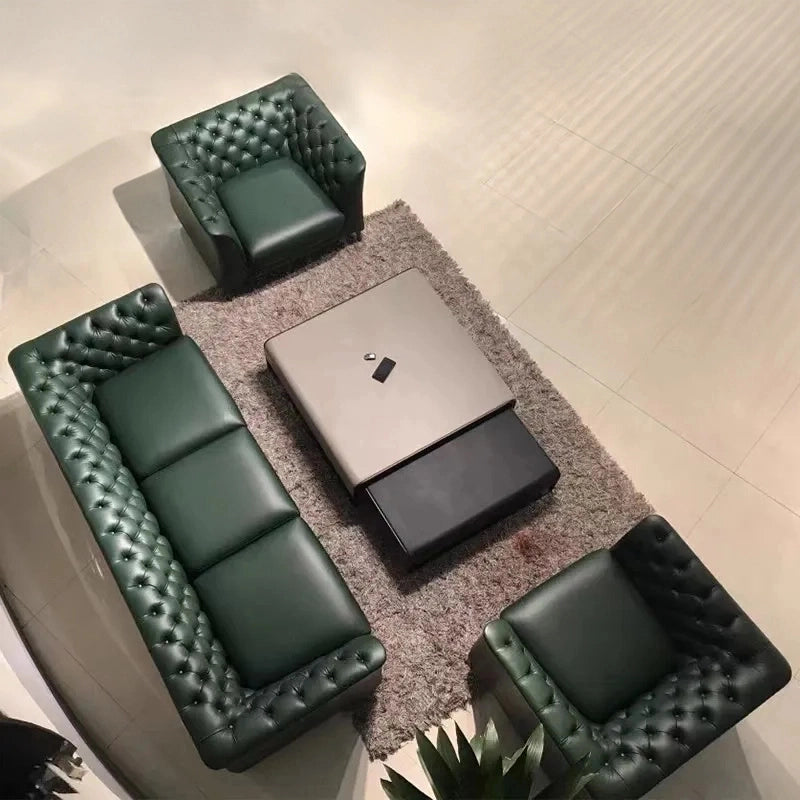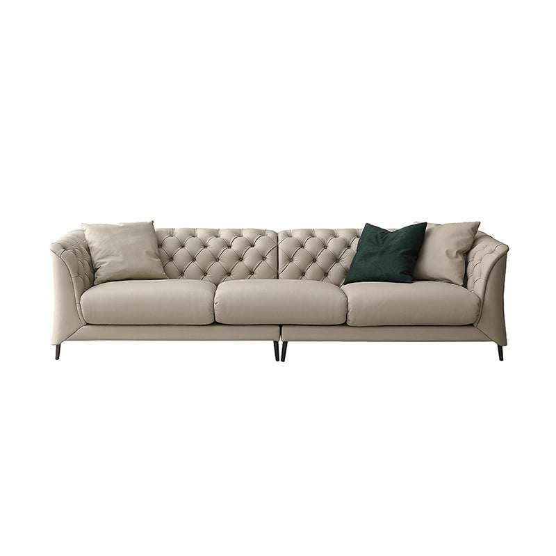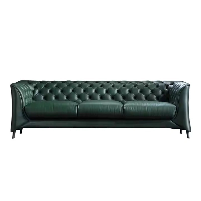 This modern Chesterfield-inspired sofa set offers a perfect fusion of traditional elegance and contemporary minimalism. Crafted in premium pure leather, it features gently flared arms, structured seat cushions, and uniform diamond-tufted detailing that speaks to both style and comfort. Available in 1, 3, and 4-seater layouts, this luxury sofa set adapts seamlessly to any sophisticated living room. The low-slung silhouette, matte black legs, and crisp seamwork align beautifully with upscale interiors. Whether you're choosing a 3 seater couch or full leather couch set, this piece defines the essence of modern luxury.