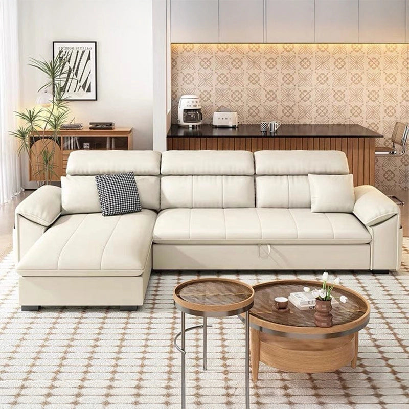 Cream leatherette L-shape with storage — sofa cum bed, convertible couch bed, L shape